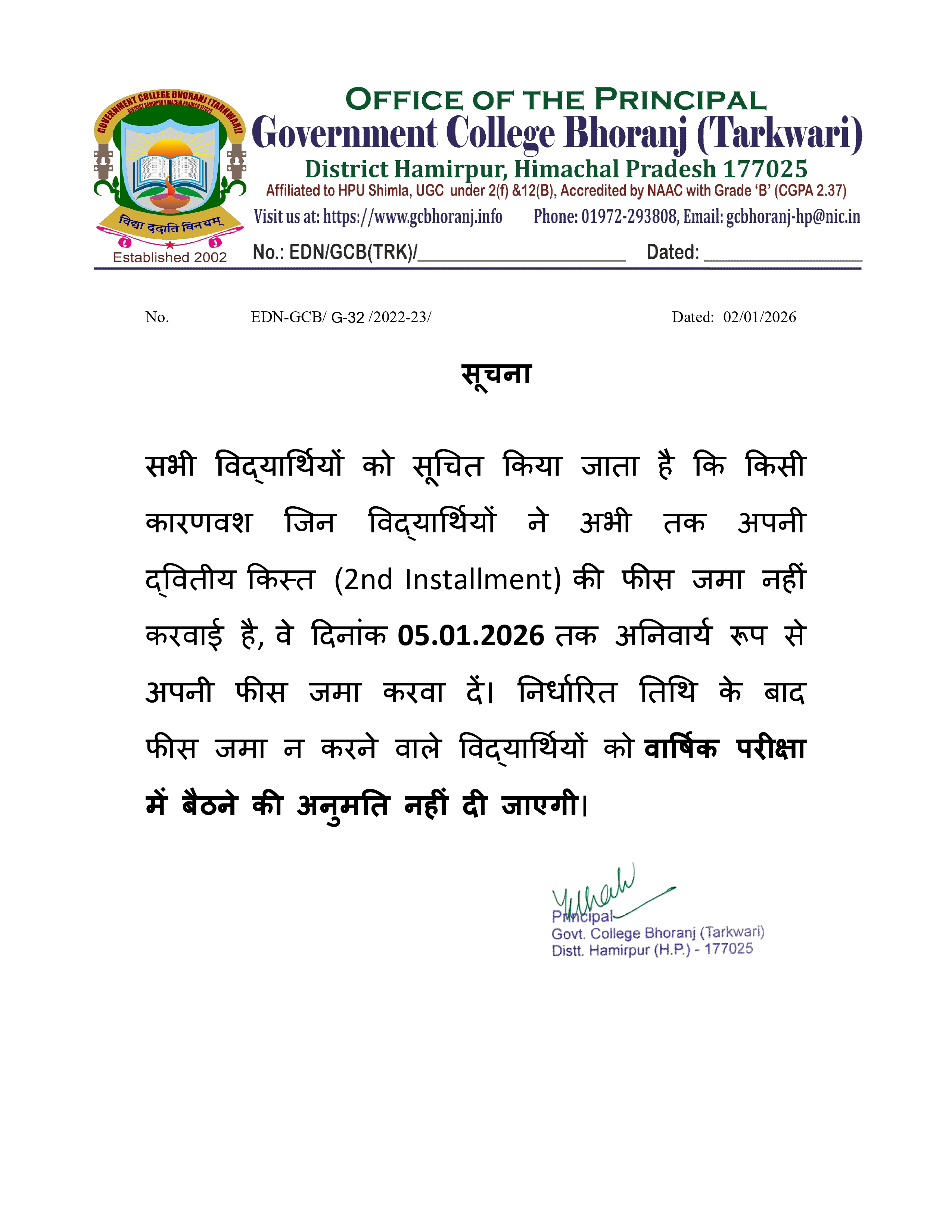 Notice of students for 2nd Installment fee 2025-26 Dated : Jan 03, 2026